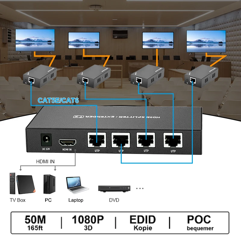 Divide the HD video source into four single-line transmission high-definition video signals up to 60 meters;