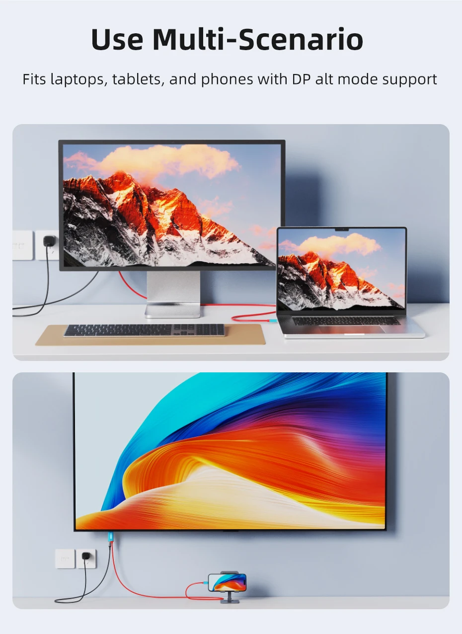 Works with Nintendo Switch / Switch OLED / Switch 2 (not Switch Lite), Steam Deck, ROG Ally, MacBook, iPad, Android phones, and other USB-C devices with DP Alt mode. One cable, endless options.